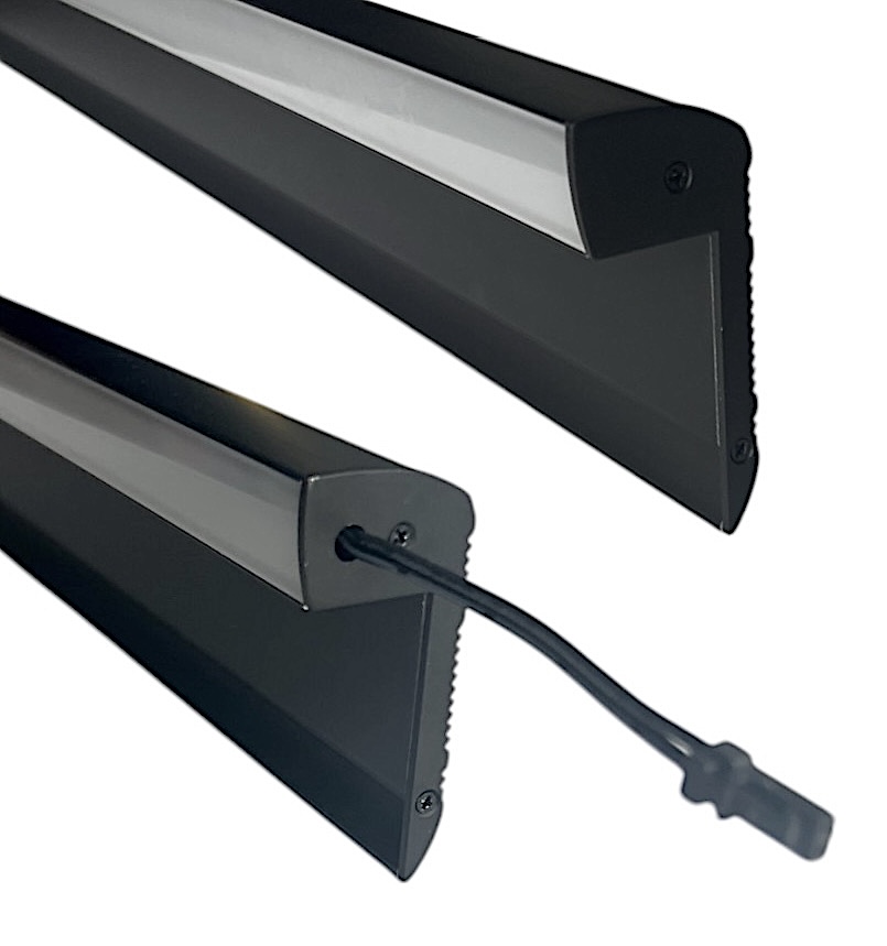 The Linea STR is a stair downlight aluminum profile with a black finish. It is used to light the undersides of stairs and provides grip for your shoes via a textured rubber insert.